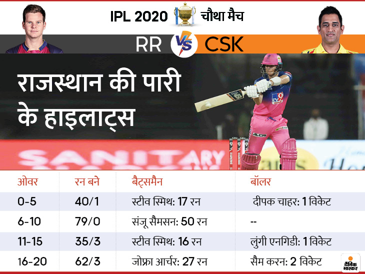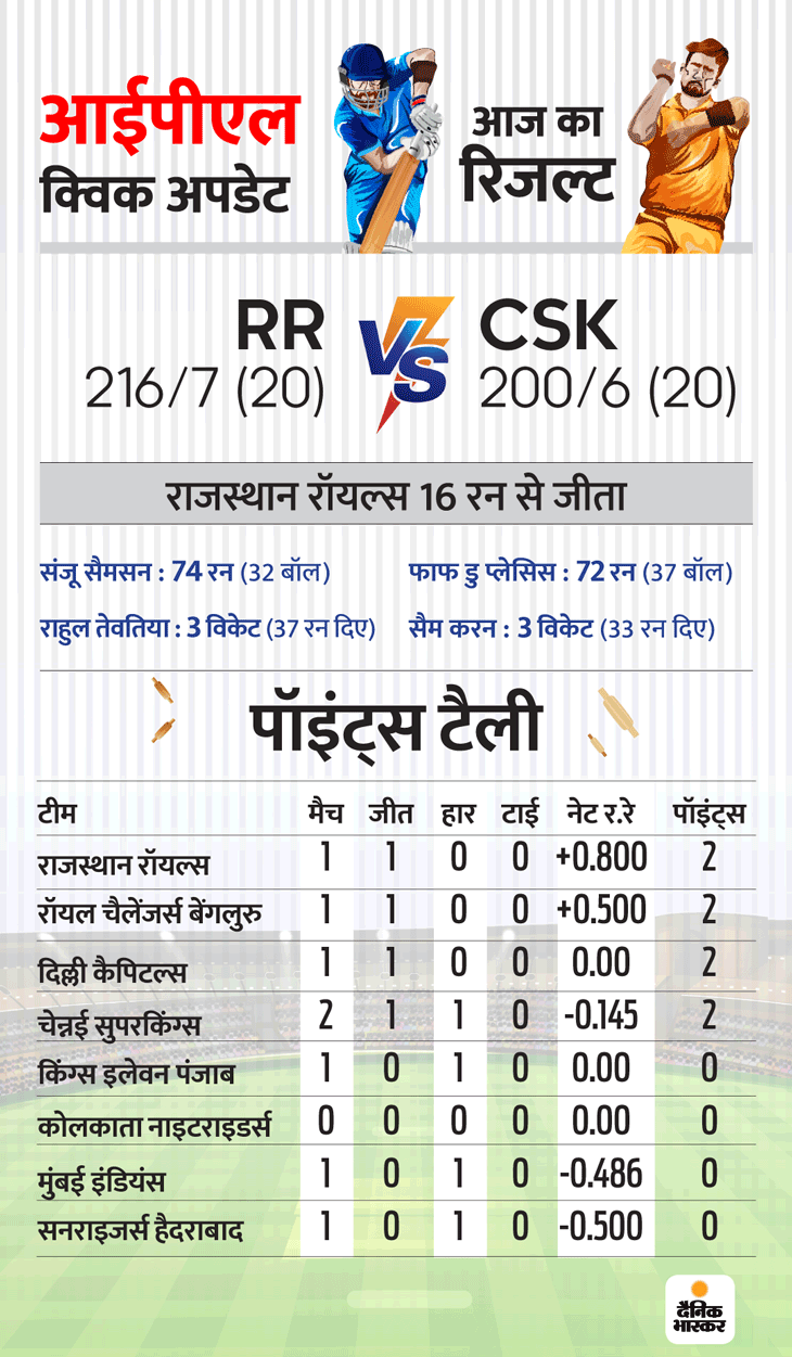 रॉयल्स की जीत के हीरो संजू सैमसन और स्पिनर राहुल तेवतिया रहे। सैमसन ने 32 बॉल पर 74 रन की पारी खेली थी। वहीं, तेवतिया ने चेन्नई के तीन खिलाड़ियों को आउट किया।