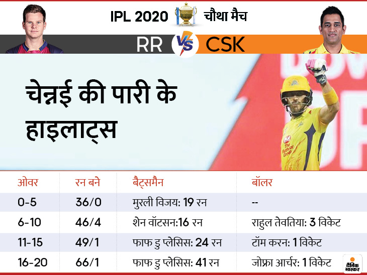 लक्ष्य का पीछा करने उतरी चेन्नई को शेन वॉट्सन (33) और मुरली विजय (21) ने मजबूत शुरुआत दी, लेकिन 7वें ओवर में खेल बिगड़ गया। स्पिनर राहुल तेवतिया ने अपने पहले ओवर में वॉट्सन को आउट किया। फिर दूसरे ओवर की आखिरी दो बॉल पर सैम करन (17) और रितुराज गायकवाड़ को बिना खाता खोले आउट कर मैच पलट दिया।