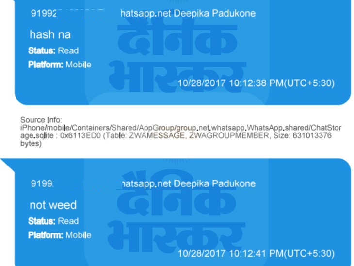 ड्रग्स चैट मामले में नारकोटिक्स कंट्रोल ब्यूरो (एनसीबी) की जांच में बड़ा खुलासा हुआ है। सोमवार रात से इस केस में दीपिका पादुकोण और उनकी मैनेजर करिश्मा प्रकाश के बीच हुई बातचीत के हिस्से सामने आ रहे थे। इनमें दीपिका के लिए D और करिश्मा के लिए K कोडनेम का इस्तेमाल किया जा रहा था, लेकिन सबसे पहले भास्कर को दीपका पादुकोण की वॉट्सऐप चैट के स्क्रीनशॉट्स मिले हैं। दीपिका-करिश्मा के बीच यह बातचीत 28 अक्टूबर 2017 को हुई थी।