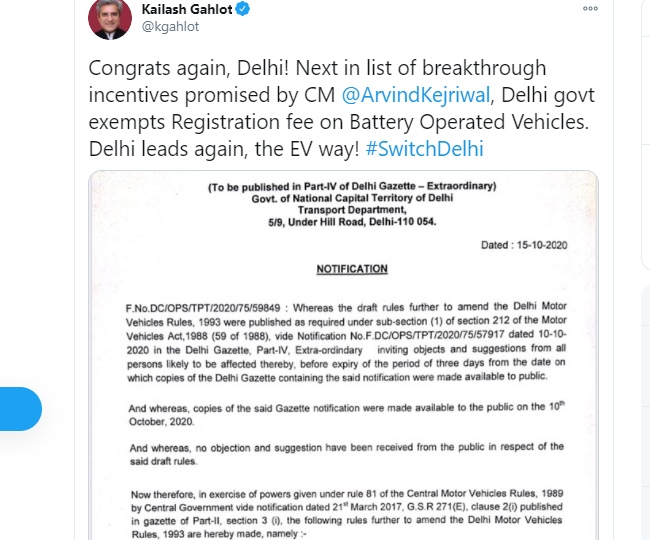 दिल्ली में सत्तासीन आम आदमी पार्टी सरकार ने इलेक्ट्रिक वाहनों के पंजीकरण शुल्क में बड़ी राहत देने का एलान किया है। इसके तहत वाहनों के पंजीकरण शुल्क में छूट देने की घोषणा की गई है। बैटरी से संचालित वाहनों के लिए कोई पंजीकरण शुल्क नहीं लिया जाएगा। यह एलान दिल्ली के सीएम अरविंद केजरीवाल ने शुक्रवार को पत्रकार वार्ता के दौरान किया। इससे इलेक्ट्रिक वाहनों की खरीद के इच्छुक लोगों को बड़ी राहत मिली है। इस एलान के बाद दिल्ली के परिवहन मंत्री कैलाश गहलौत ने ट्वीट कर मुख्यमंत्री अरविंद को इस घोषणा के लिए बधाई दी है।